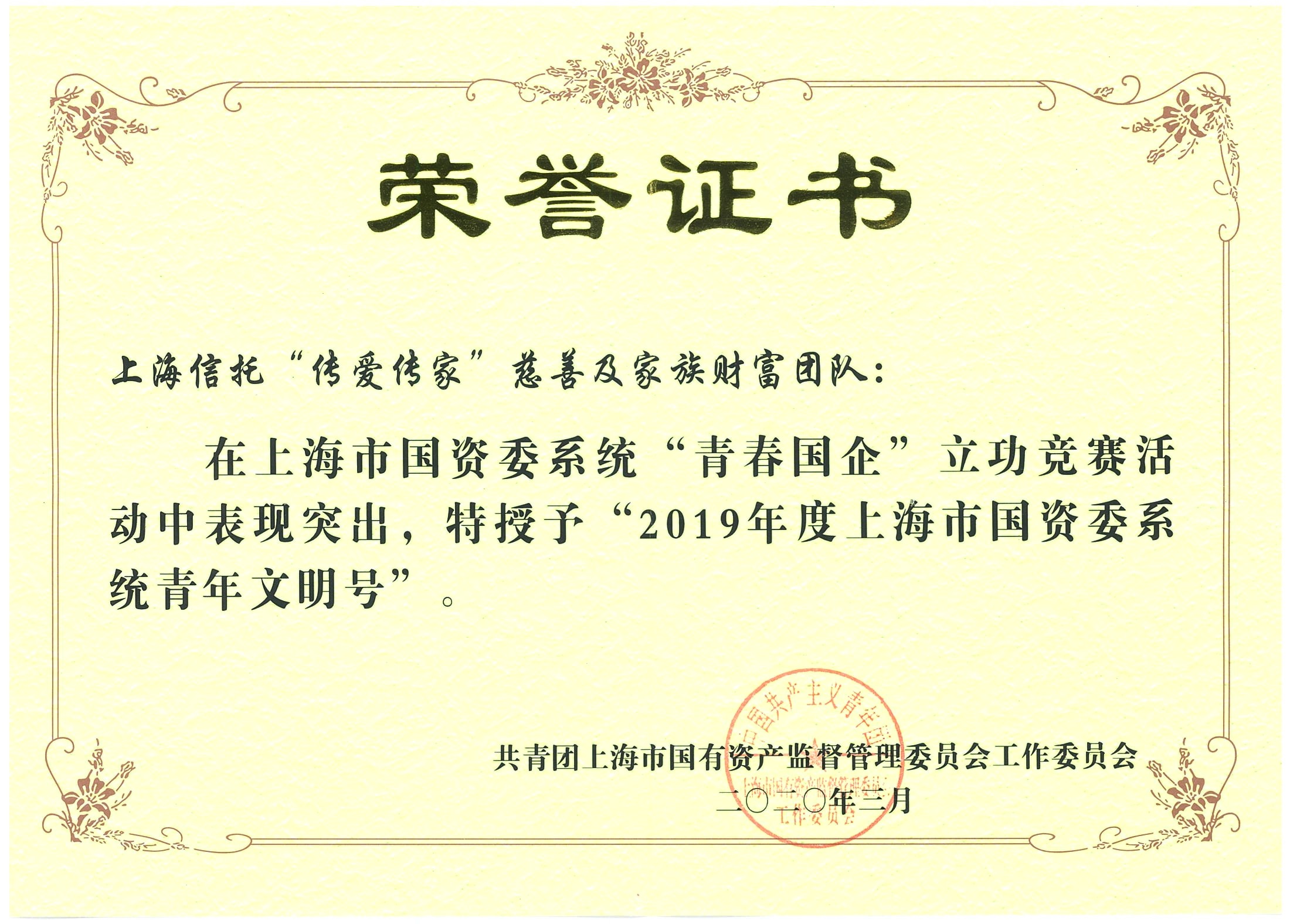 近日,上海市國資委團工委授予公司“傳愛傳家”慈善及家族財富團隊“2019年度上海市國資委系統青年文明號”榮譽稱號,表彰團隊在上海市國資委系統“青春國企”立功競賽活動中的優異表現。